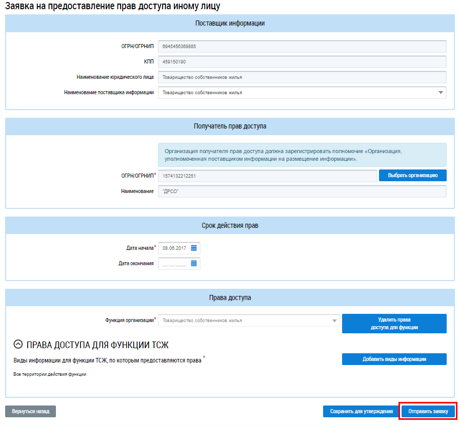 Для отправки заявки получателю прав нажмите на кнопку Отправить заявку (доступно для руководителей организации).
