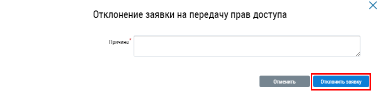 В отобразившемся окне Отклонение заявки на передачу прав доступа укажите причину отклонения в текстовом поле и нажмите на кнопку Отклонить заявку.