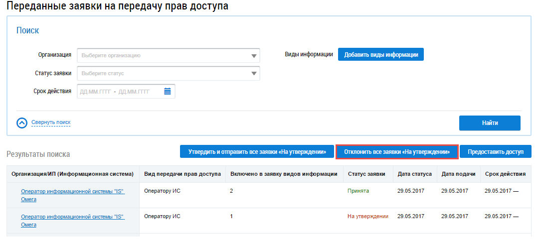 Система также предоставляет возможность отклонить все заявки в статусе На утверждении. Для этого нажмите на странице Переданные заявки на передачу прав доступа на кнопку Отклонить все заявки «На утверждении.