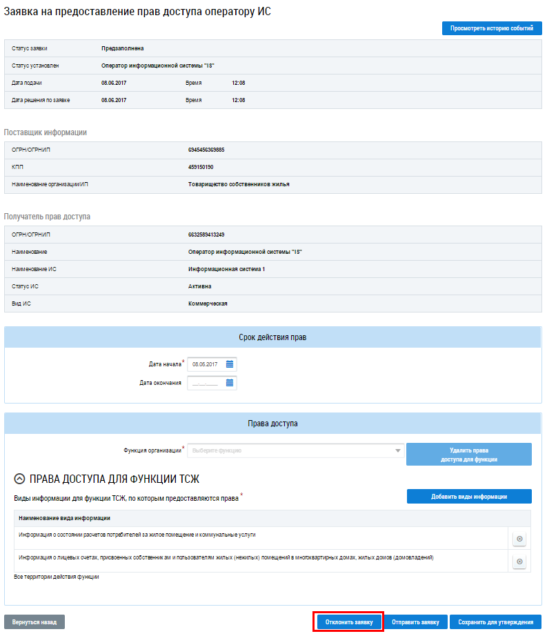Операция отклонения заявки доступна руководителю организации для заявок в статусе На утверждении и Предзаполнена.