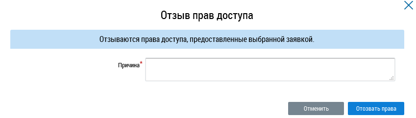 В отобразившемся окне укажите причину отзыва прав доступа и нажмите на кнопку Отозвать права.