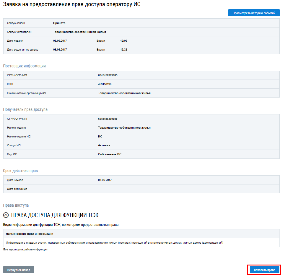 Операция отзыва прав доступа доступна для заявок в статусе Принята.