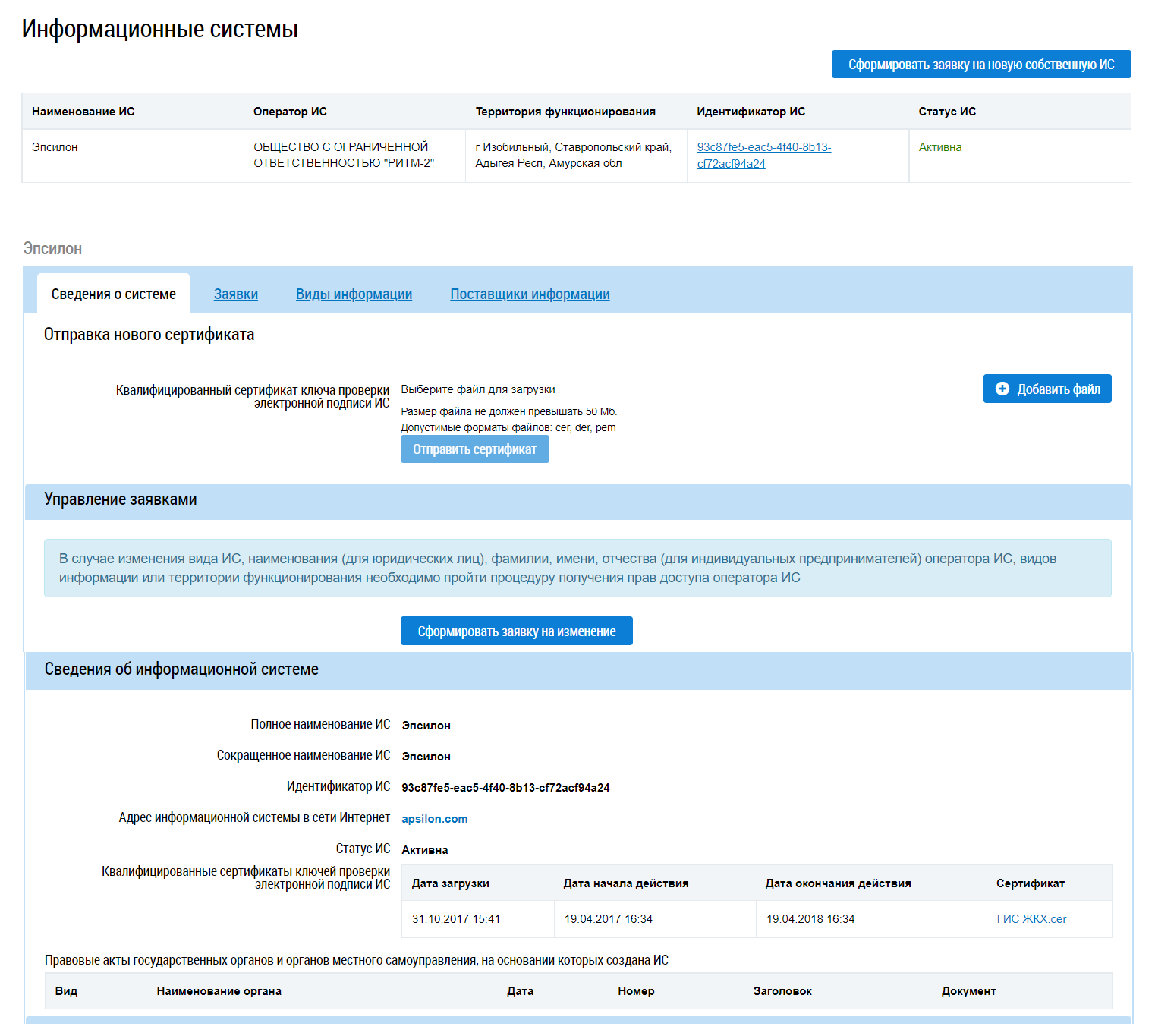 Работа с информационными системами: формирование и отзыв заявки на ИС, просмотр информации об ИС, отправка сертификата ключа.