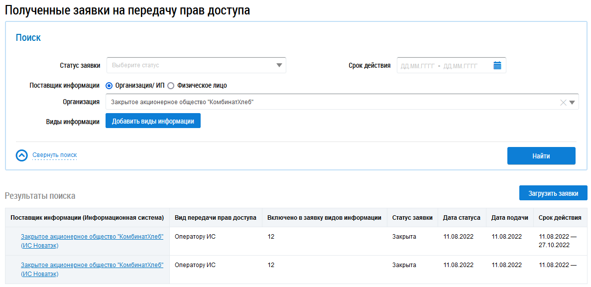 При нажатии на кнопку Все заявки на передачу прав доступа осуществляется переход на страницу просмотра заявок на передачу прав доступа, полученных от поставщиков информации (организаций/ИП и физических лиц), для выбранной организации.