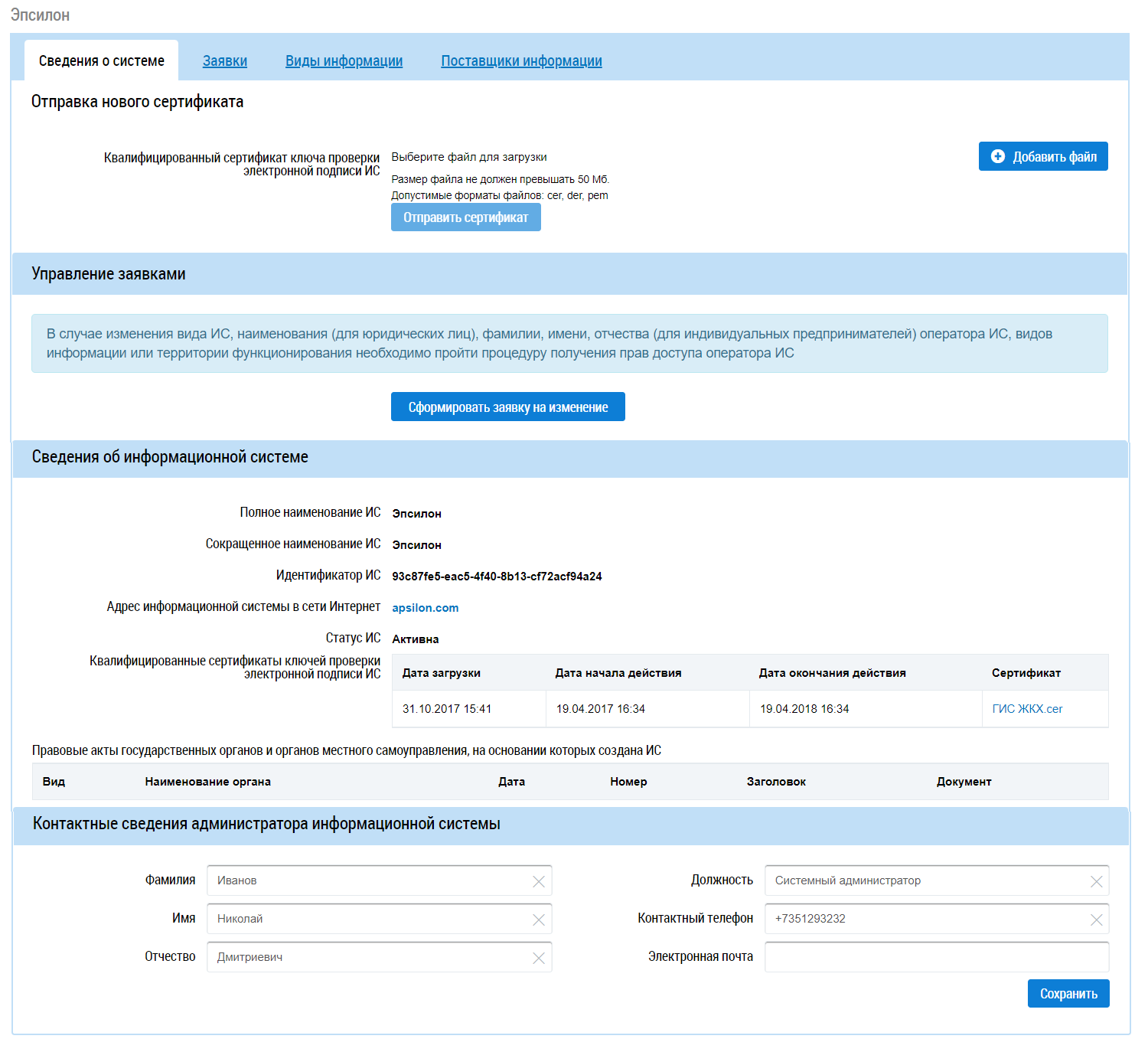 Вкладка Сведения о системе содержит общую информацию об ИС, а также предоставляет возможность изменения ИС. Подробнее об изменении ИС сказано в п. Формирование заявки на изменение собственной информационной системы.
