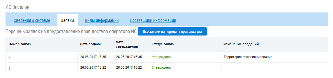Вкладка Заявки содержит сведения о поданных ранее заявках на предоставление прав доступа. Для просмотра заявки нажмите на гиперссылку с ее номером.