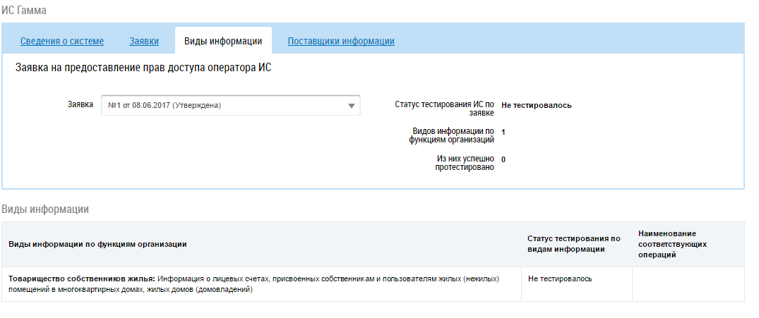 Вкладка Виды информации содержит сведения о тестировании ИС и результатах тестирования, если была подана заявка на тестирование. Для просмотра результатов тестирования определенной заявки выберите в выпадающем списке поля Заявка необходимое значение.