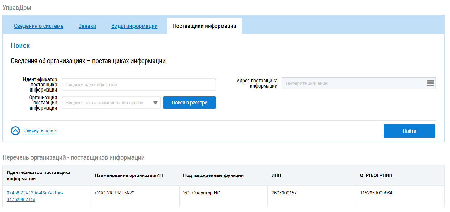 В случае необходимости воспользуйтесь блоком поиска организации. Установите необходимые параметры поиска и нажмите на кнопку Найти. В блоке Перечень организаций-поставщиков информации отобразятся организации, соответствующие поисковому запросу.