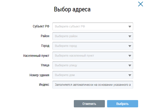 Последовательно выберите необходимые значения из выпадающих списков, начиная с поля Субъект РФ, и нажмите на кнопку Выбрать.