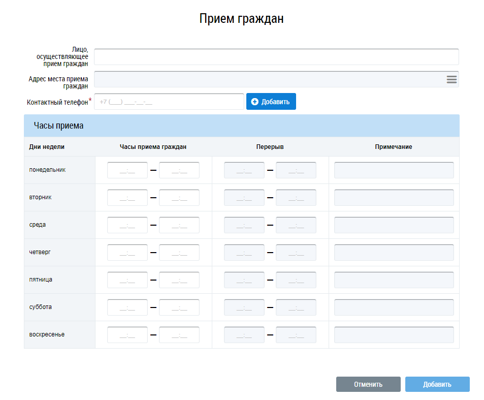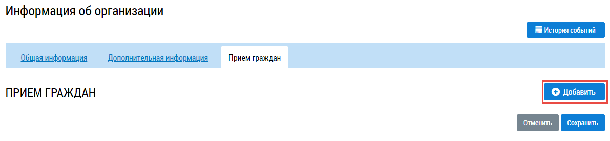 Для добавления информации о приеме граждан перейдите на вкладку Прием граждан и нажмите на кнопку Добавить.