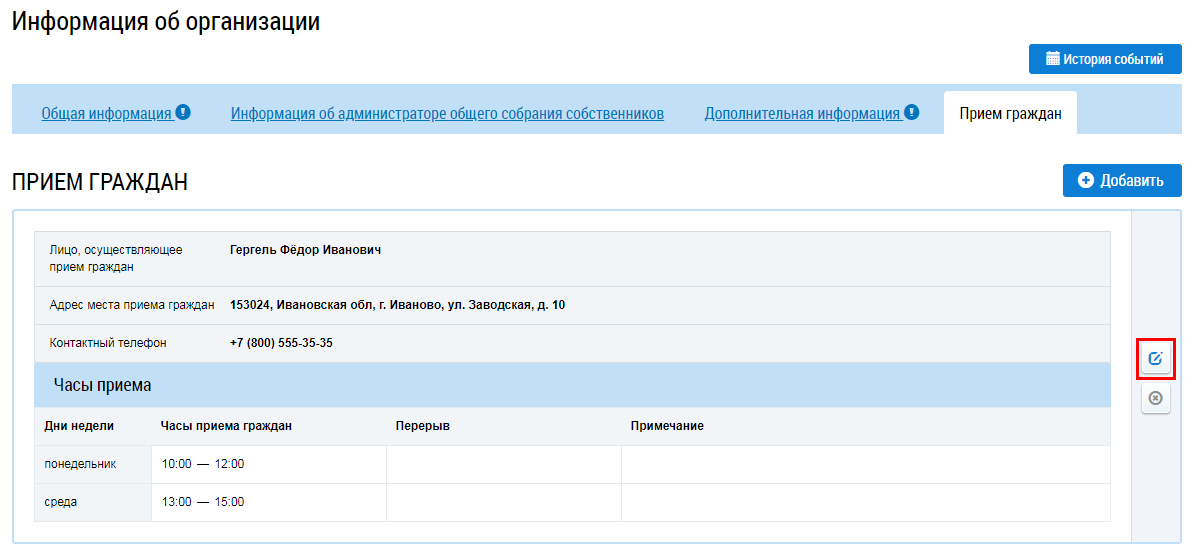 Для редактирования информации о приеме граждан нажмите на пиктограмму редактирования напротив блока с подлежащей редактированию информацией о приеме.
