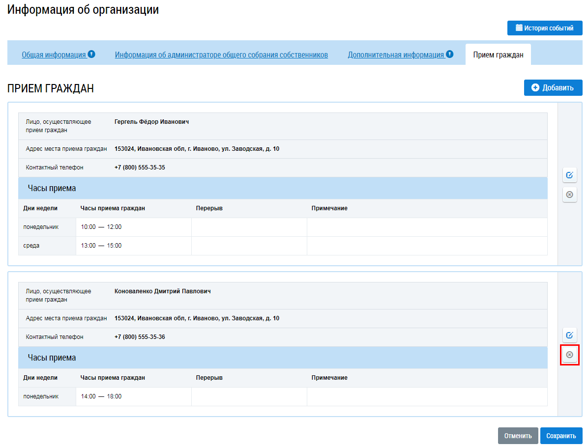 Для удаления информации о приеме граждан нажмите на пиктограмму удаления напротив блока с подлежащей удалению информацией о приеме.