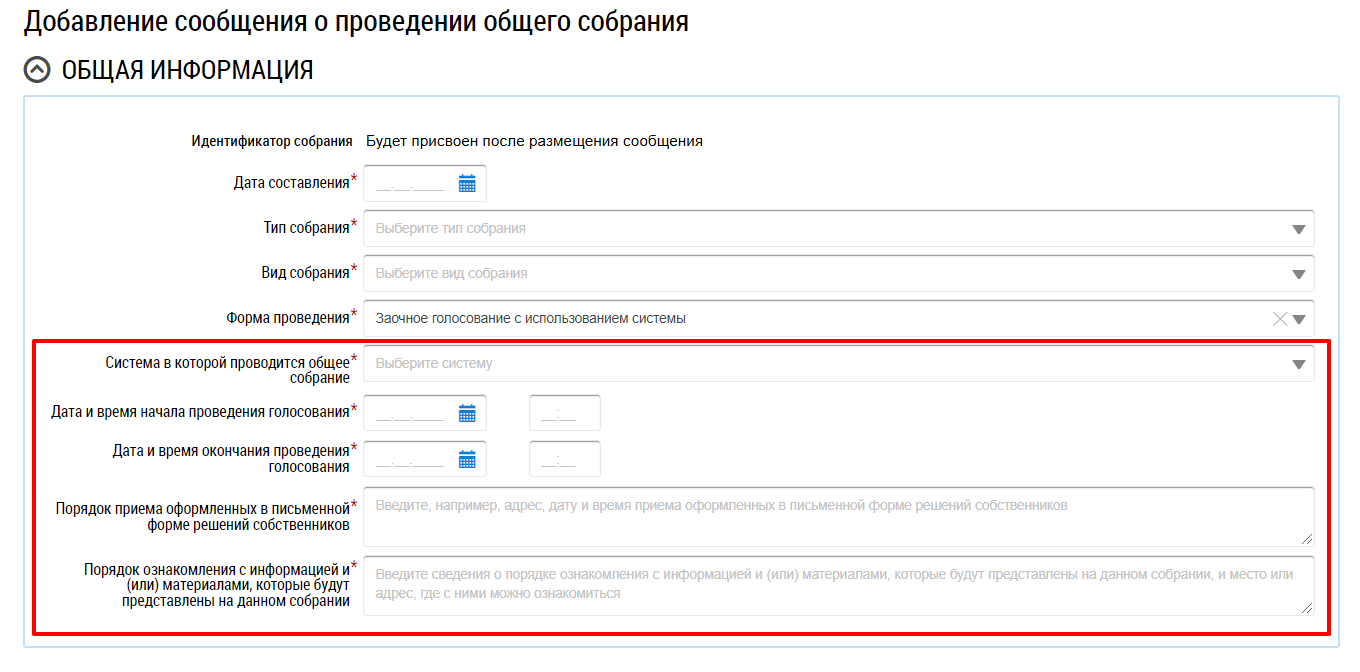 При выборе формы собрания «Заочное голосование с использованием системы» отображаются дополнительные поля.