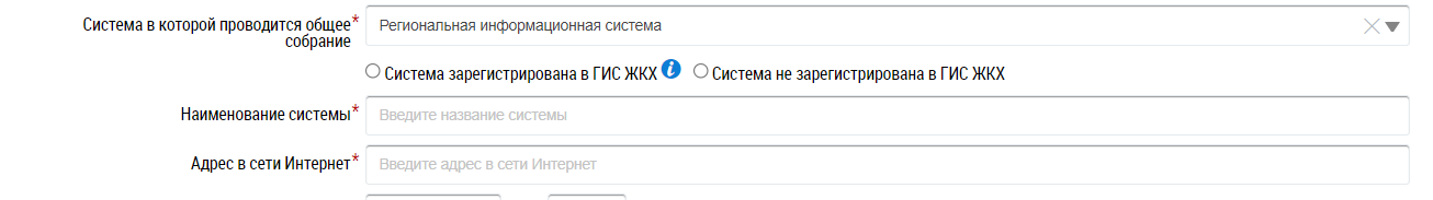 При выборе значения Региональная информационная система также отображается поле Первое общее собрание собственников с использованием системы. При необходимости установите флажок в этом поле.