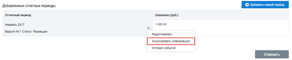 Чтобы аннулировать информацию об отчетном периоде, раскройте контекстное меню и выберите пункт Аннулировать информацию.