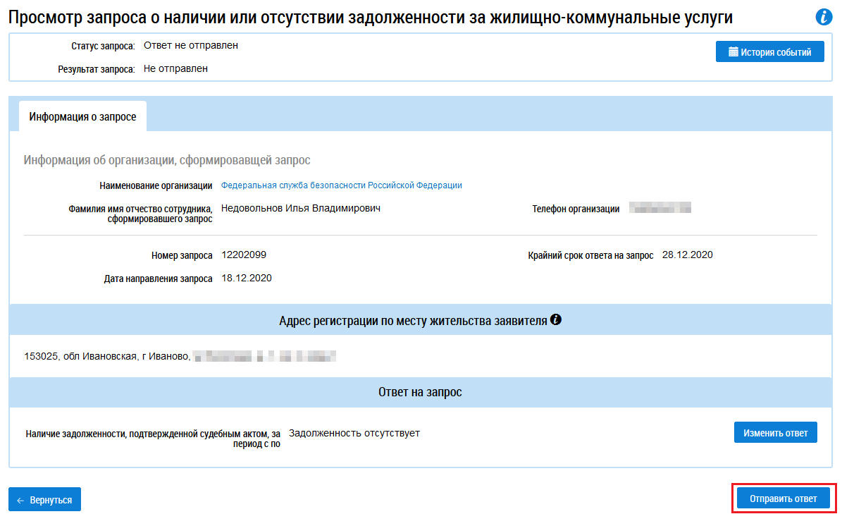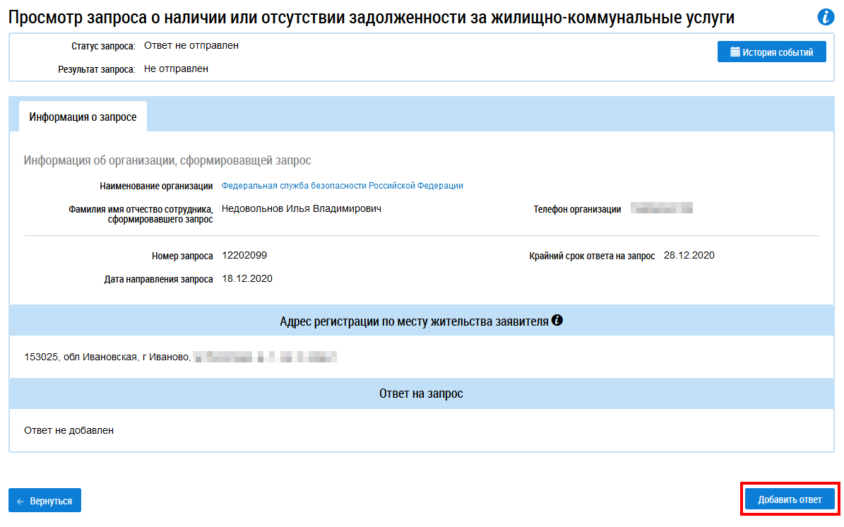 Для формирования и отправки ответа на запрос о наличии или отсутствии задолженности за ЖКУ откройте запрос в статусе Ответ не отправлен на просмотр и нажмите на кнопку Добавить ответ.
