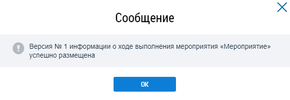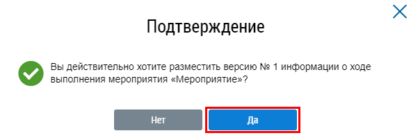 Для размещения информации о ходе выполнения мероприятия выберите пункт контекстного меню Разместить (см. Контекстное меню информации о ходе выполнения мероприятия в статусе «Проект»). Подтвердите действие по размещению информации, нажав на кнопку Да.