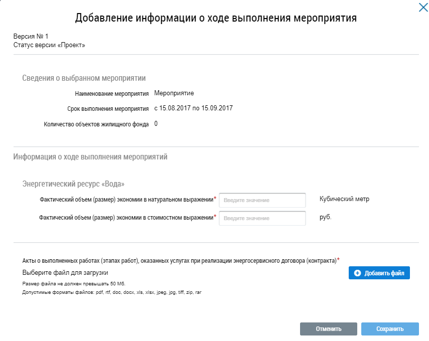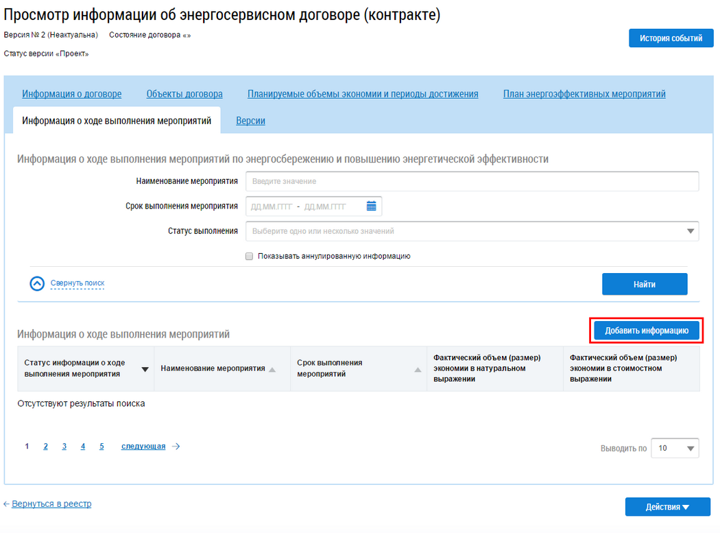 Действия по добавлению информации о ходе выполнения мероприятия доступны в режиме просмотра информации об энергосервисном договоре (контракте).