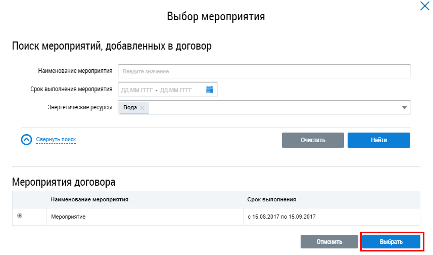 Введите параметры поиска и нажмите на кнопку Найти. Затем установите переключатель напротив мероприятия и нажмите на кнопку Выбрать.