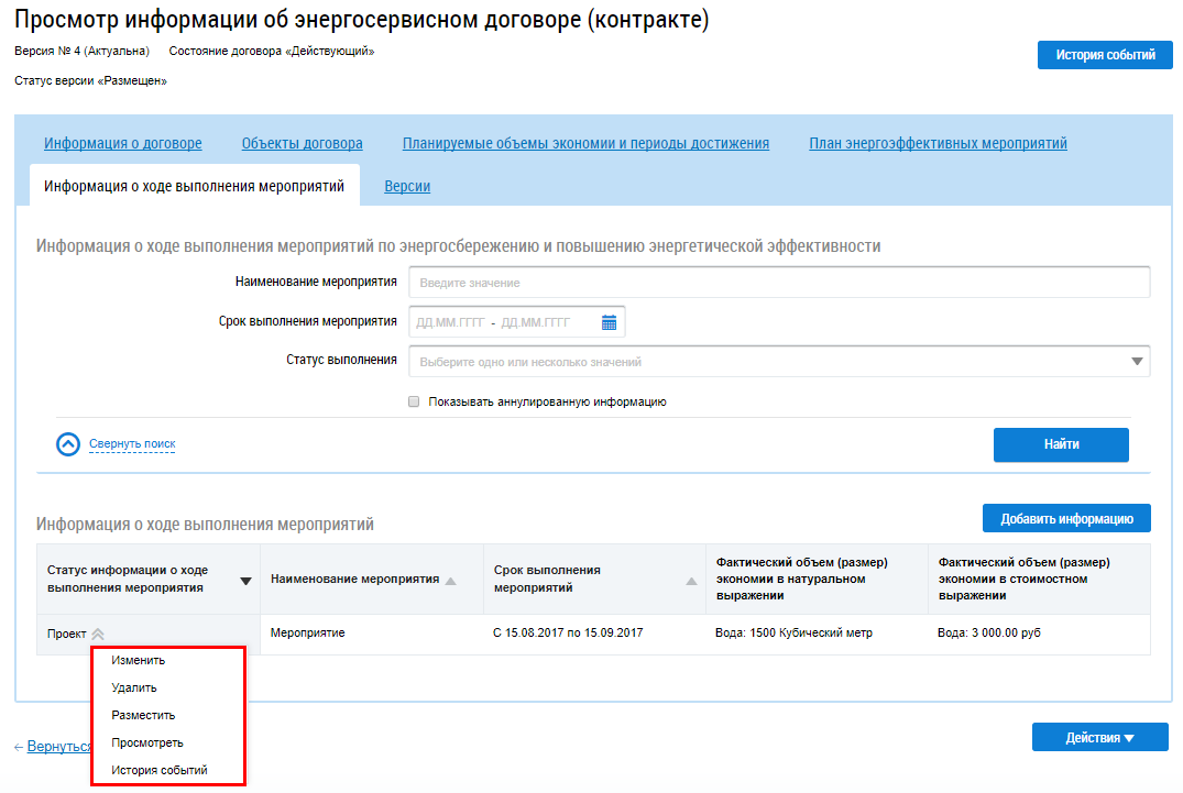 Для изменения информации о ходе выполнения мероприятия выберите пункт контекстного меню Изменить.