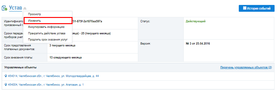 В случае необходимости аннулирования информации об уставе на странице «Реестр договоров» для необходимого устава со статусом Действующий выберите пункт контекстного меню Изменить.
