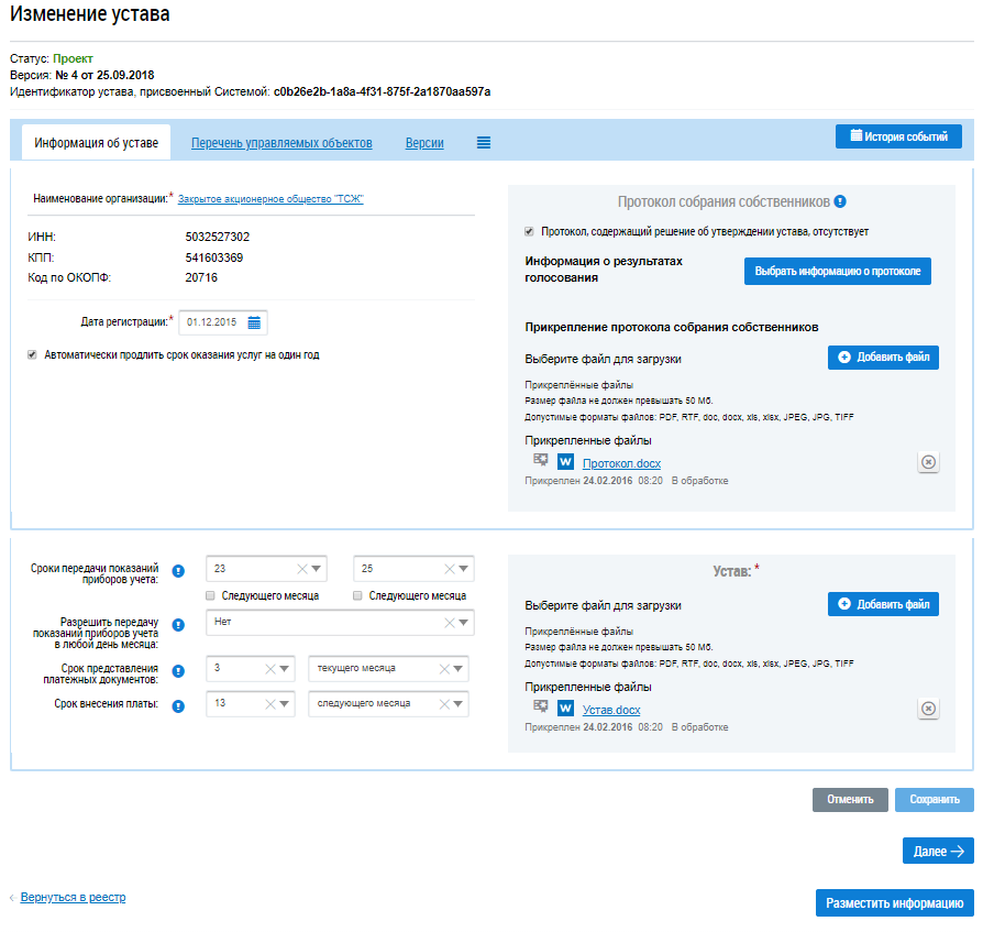 Система отображает страницу Изменение устава (статус устава изменяется на Проект).