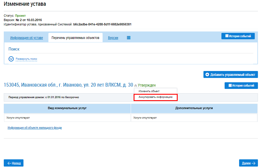 Нажмите на кнопку Да для аннулирования сведений. После подтверждения аннулирования отображается вкладка Перечень управляемых объектов содержащая удаленный дом со статусом Сведения аннулированы, статус устава Проект.