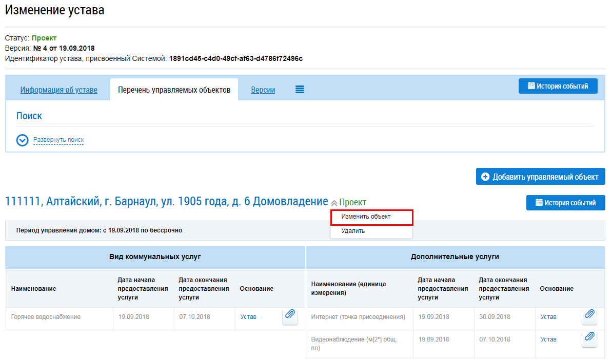 Выберите необходимый дом, затем раскройте контекстное меню выбранного дома и нажмите на пункт Изменить объект (Вкладка «Перечень управляемых объектов». Пункт контекстного меню «Изменить объект»).