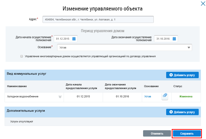 В отобразившемся окне Изменение управляемого объекта в блоке Период управления домом измените дату окончания осуществления полномочий и нажмите на кнопку Сохранить.