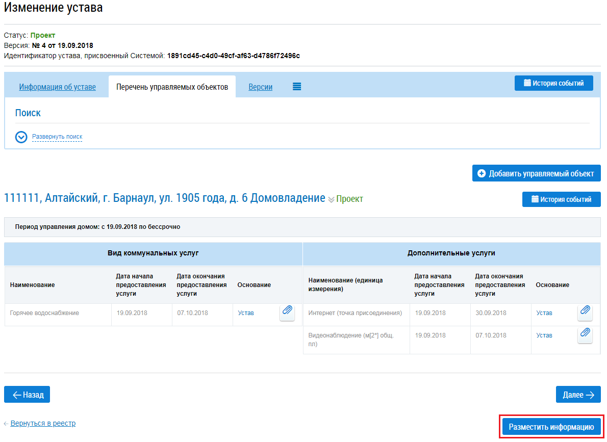 После сохранения информации об управляемом объекте нажмите на кнопку Разместить информацию.