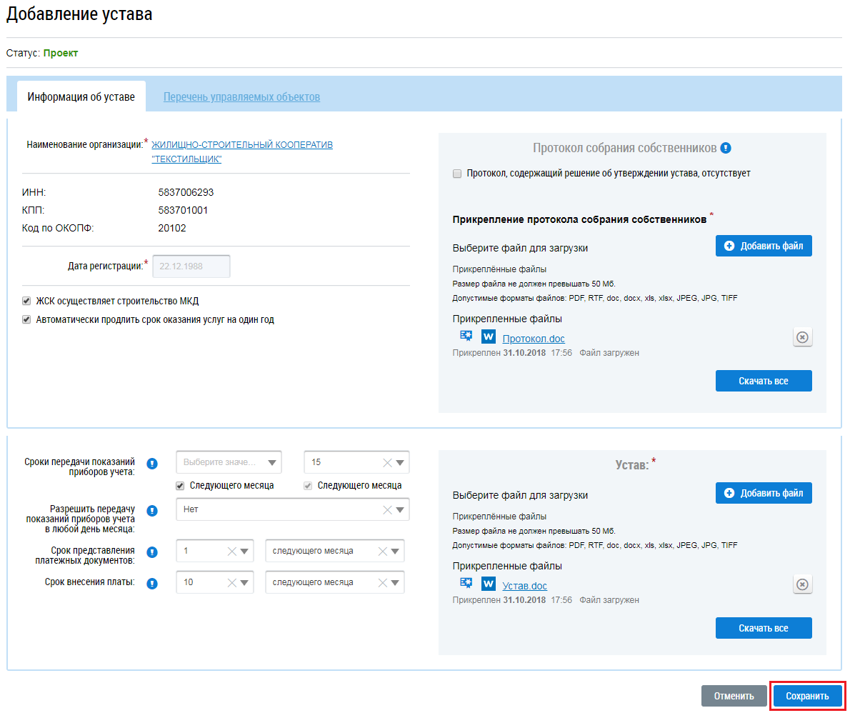 При добавлении устава жилищно-строительного кооператива отображается следующая форма создания устава.