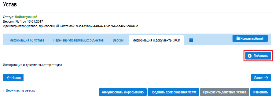 Для добавления информации и документов ЖСК нажмите на кнопку Добавить.