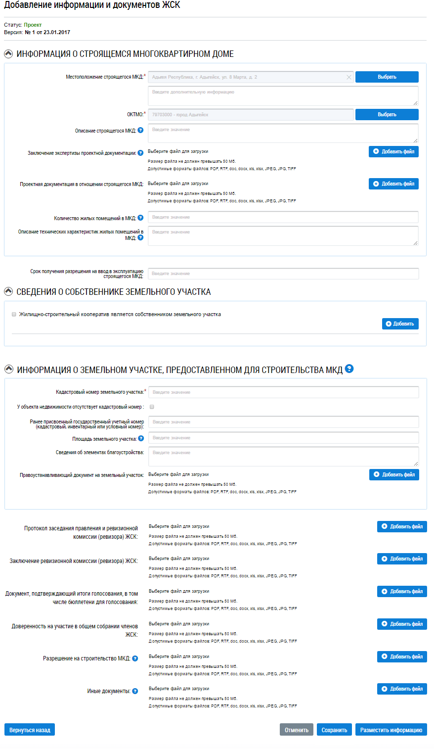 Нажмите на кнопку Сохранить. Статус информации и документов ЖСК переходит меняется на Проект.