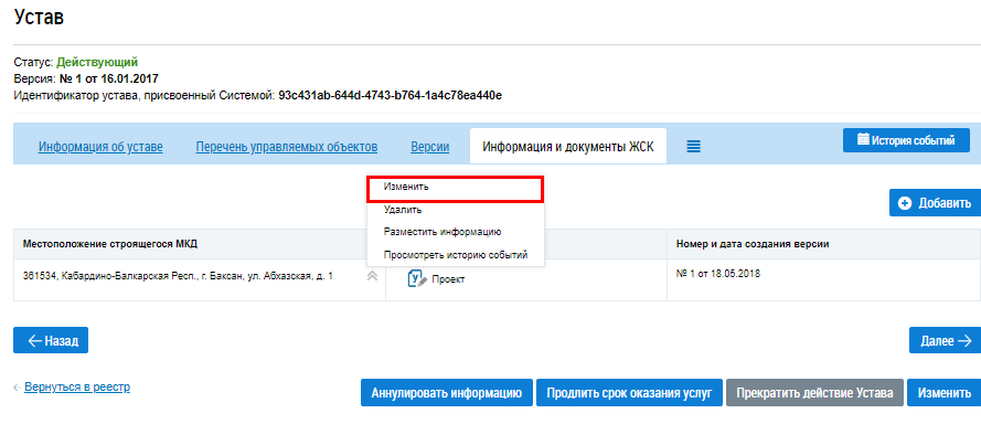 Для изменения информации и документов ЖСК раскройте контекстное меню и выберите пункт Изменить.