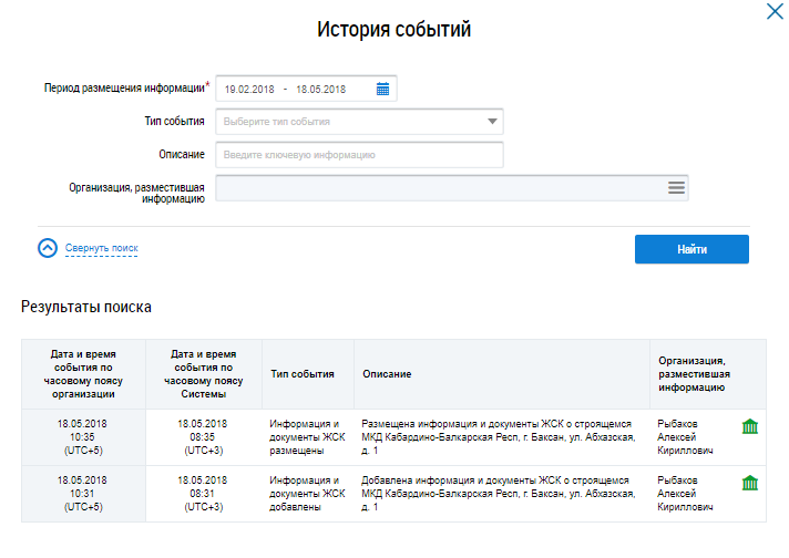 Просмотр истории событий