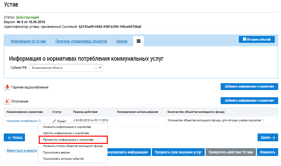 Для размещения информации о нормативе потребления коммунальных услуг выберите пункт контекстного меню Разместить информацию о нормативе.