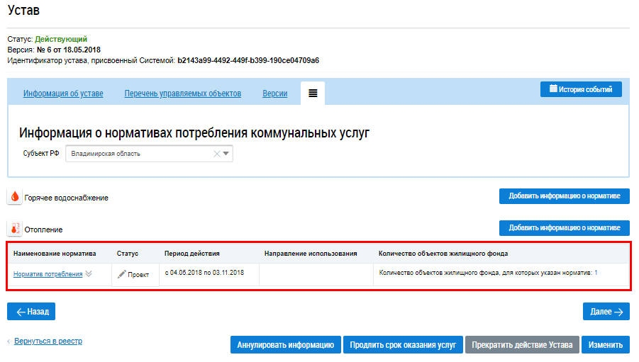 На вкладке Информация о нормативах потреблений коммунальных услуг отображаются коммунальные услуги, информация о которых размещена в уставе.