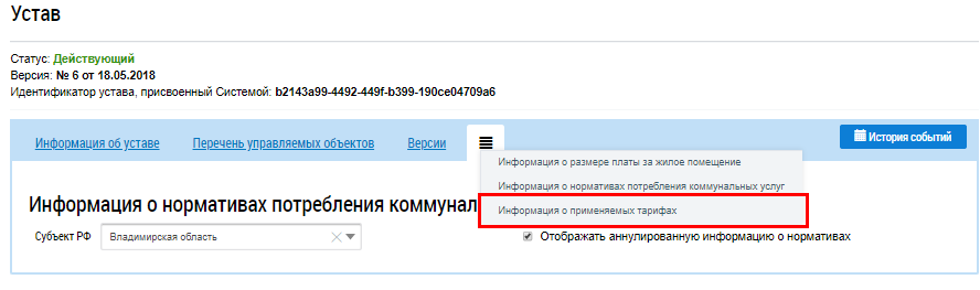 Информацию о применяемых тарифах возможно добавить, если устав был хоть раз размещен. Перейти на вкладку Информация о применяемых тарифах возможно с формы просмотра устава.