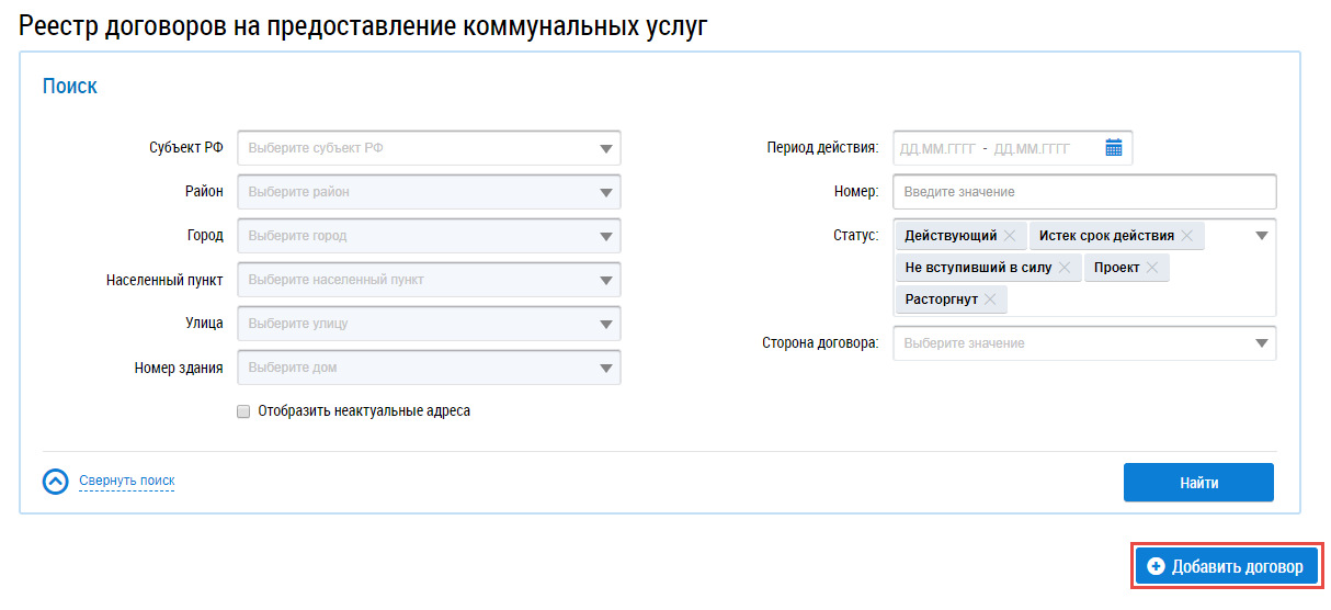 Для добавления договора нажмите на кнопку Добавить договор в реестре договоров на предоставление коммунальных услуг.
