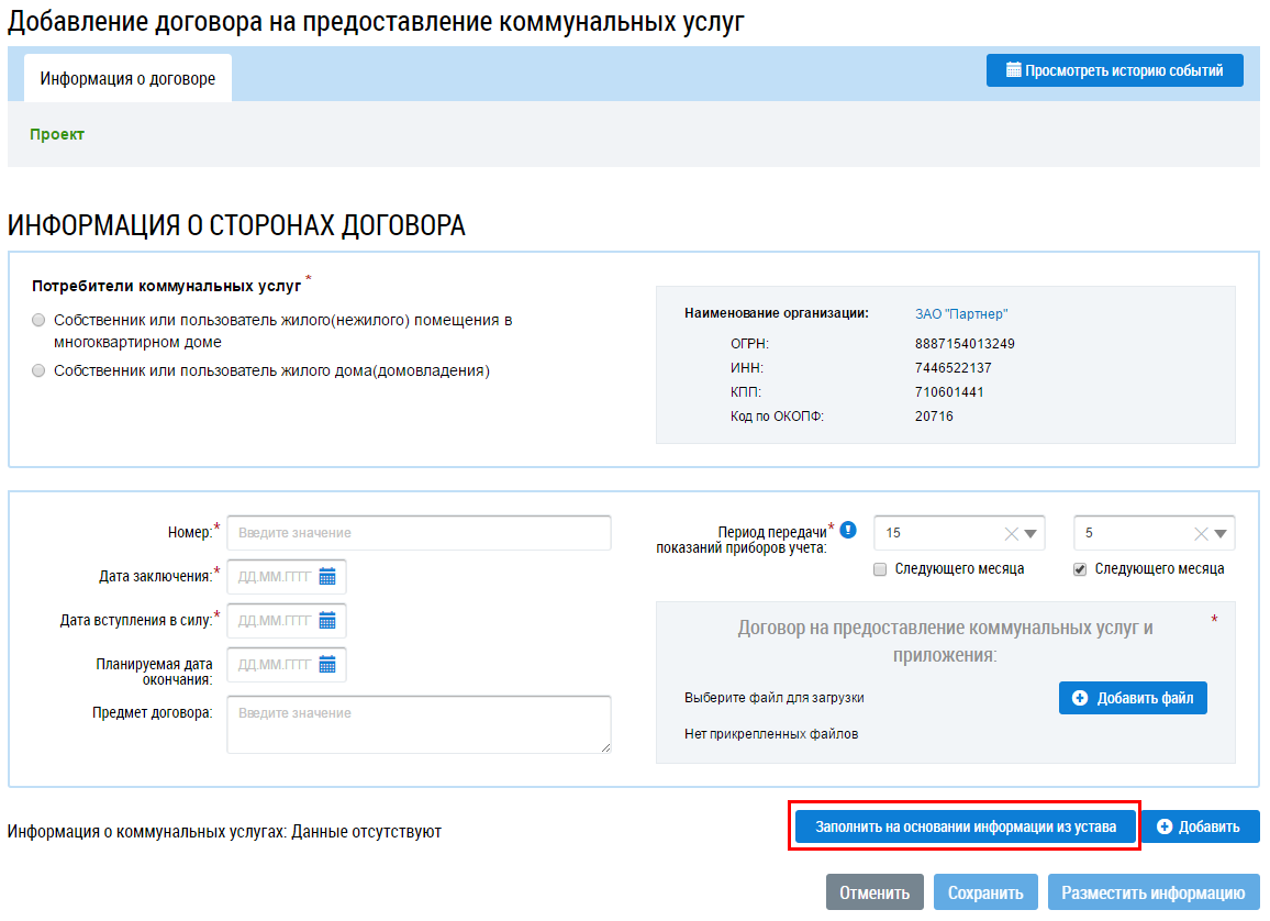 Данные из устава отображаются на странице Добавление договора на предоставление коммунальных услуг в блоке Информация о коммунальных услугах.