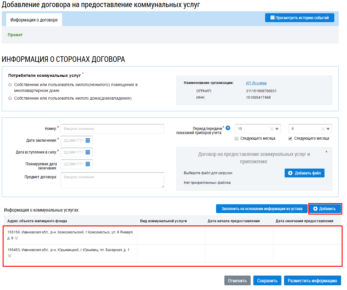 Добавление договоров на предоставление коммунальных услуг