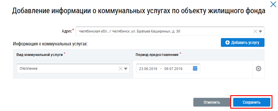 Для добавления информации о коммунальных услугах по объекту жилищного фонда нажмите на кнопку Добавить.