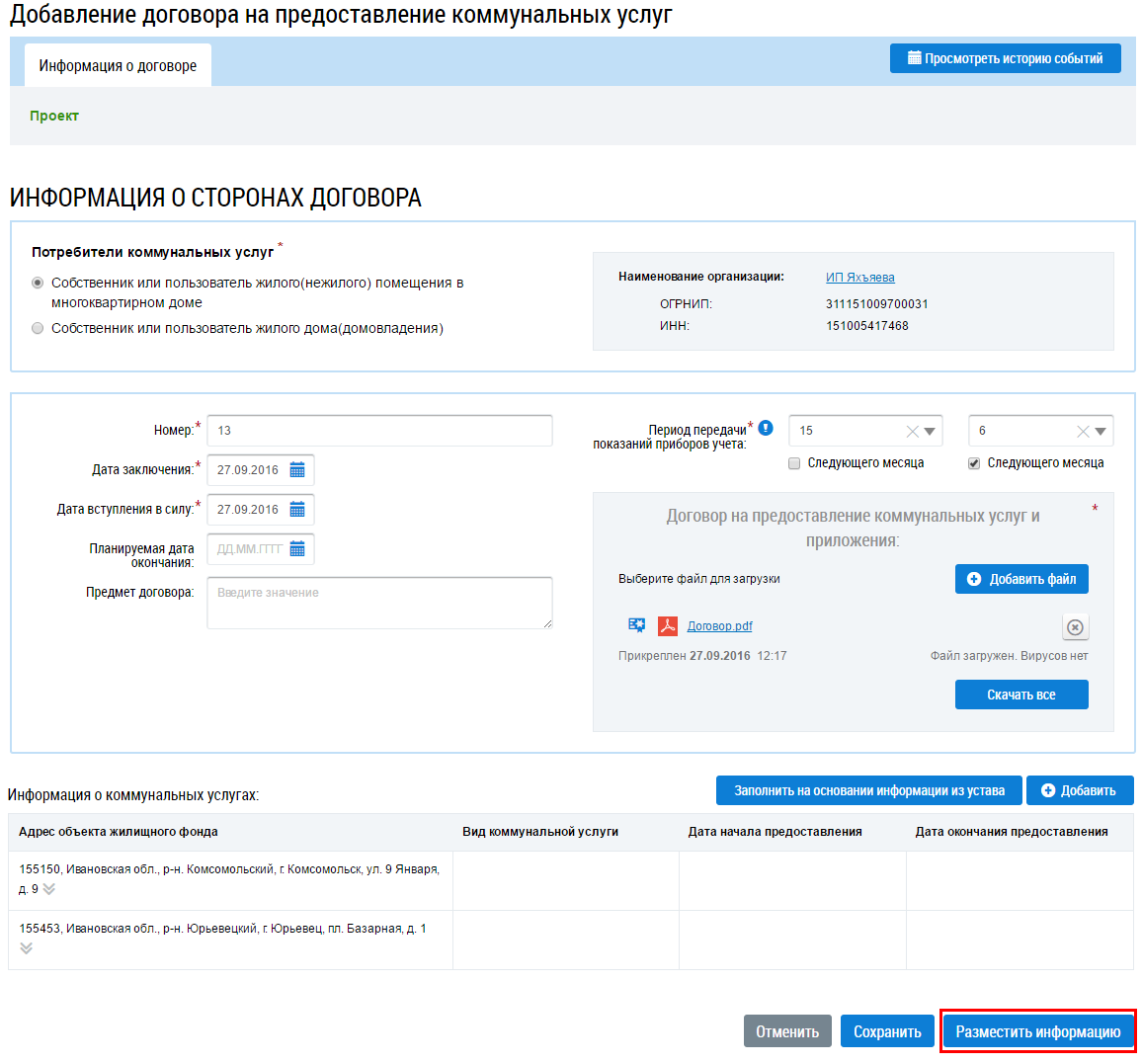 Отображается страница Добавление договора на предоставление коммунальных услуг.