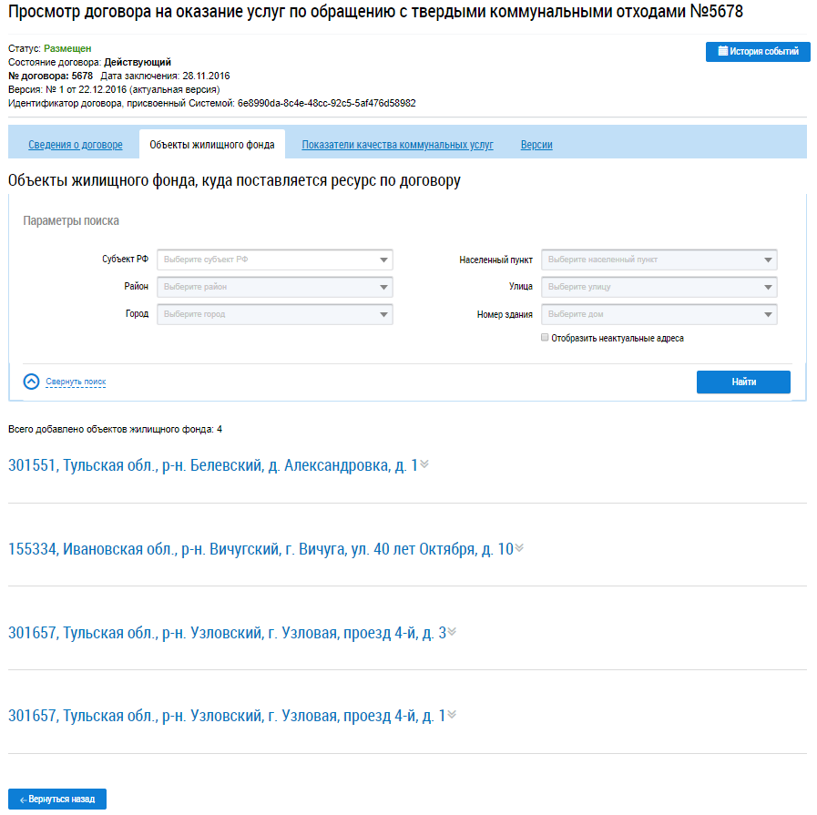 Для просмотра перечня объектов, которым по данному договору оказывается услуга по обращению с ТКО, перейдите на вкладку Объекты жилищного фонда.