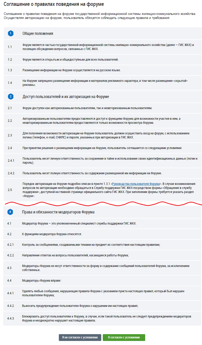 В случае если пользователь успешно авторизован в ГИС ЖКХ, при первом входе отображается страница соглашения о правилах поведения на Форуме.
