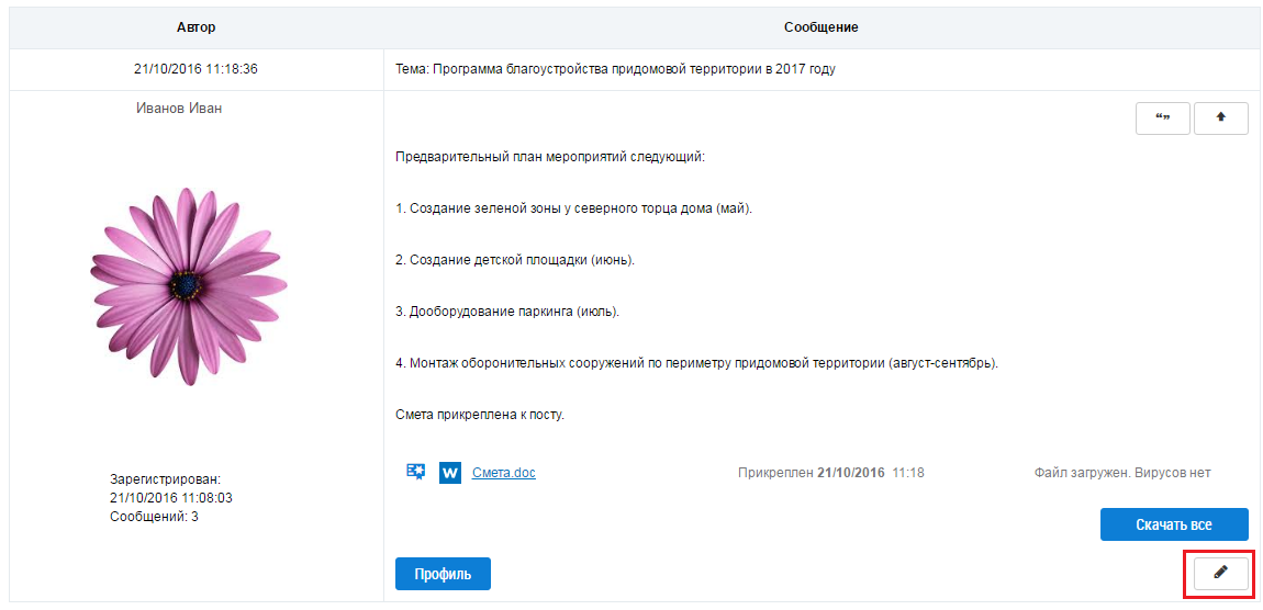 Для редактирования уже отправленного сообщения нажмите на кнопку Редактировать.