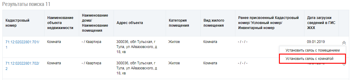 Для привязки записи о комнате перейдите на вкладку Сведения о помещениях, комнатах, выберите нужную запись, раскройте контекстное меню записи и выберите пункт Установить связь с комнатой.