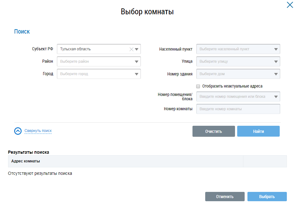 Последовательно заполните поля адреса, выбирая значения из выпадающих списков. Нажмите на кнопку Найти. Выберите комнату в блоке результатов поиска и нажмите на кнопку Выбрать. Подтвердите действие. Отображается страница с информацией о комнате, с которым установлена связь.