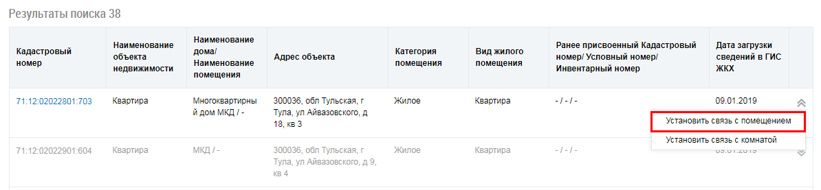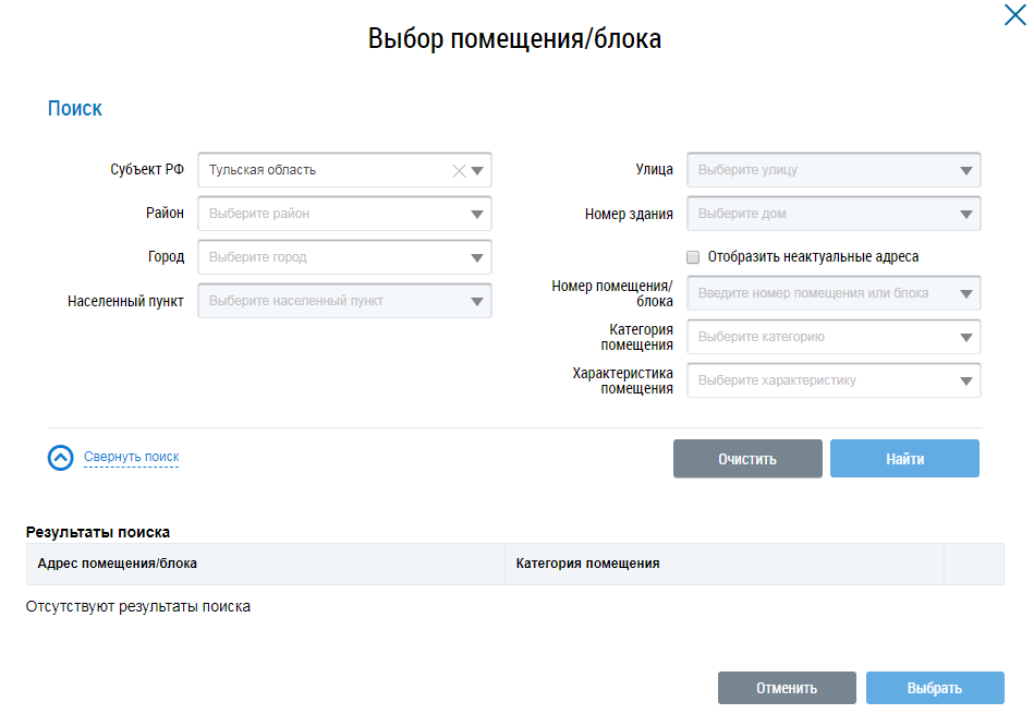 Последовательно заполните поля адреса, выбирая значения из выпадающих списков. При необходимости укажите категорию и характеристику помещения. Нажмите на кнопку Найти. Выберите помещение в блоке результатов поиска и нажмите на кнопку Выбрать. Подтвердите действие. Отображается страница с информацией о помещении, с которым установлена связь.