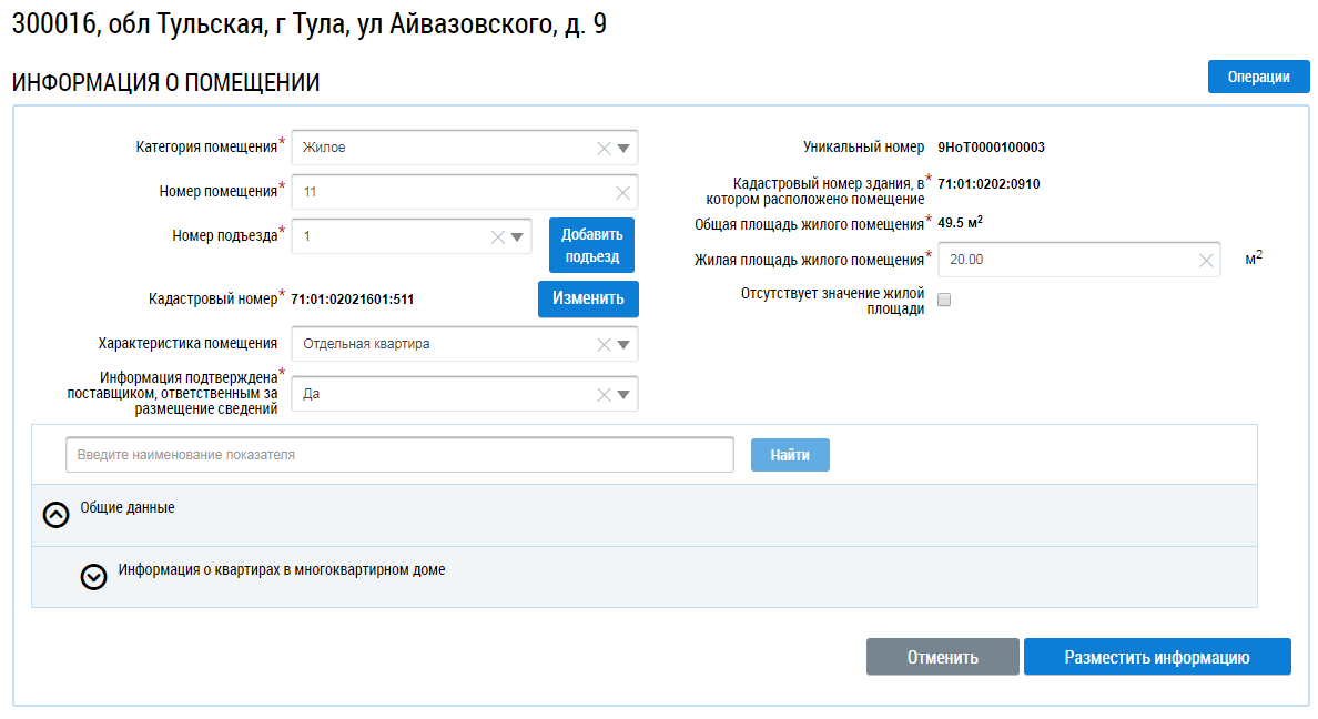 При необходимости скорректируйте информацию о помещении и нажмите на кнопку Разместить информацию. Готово.